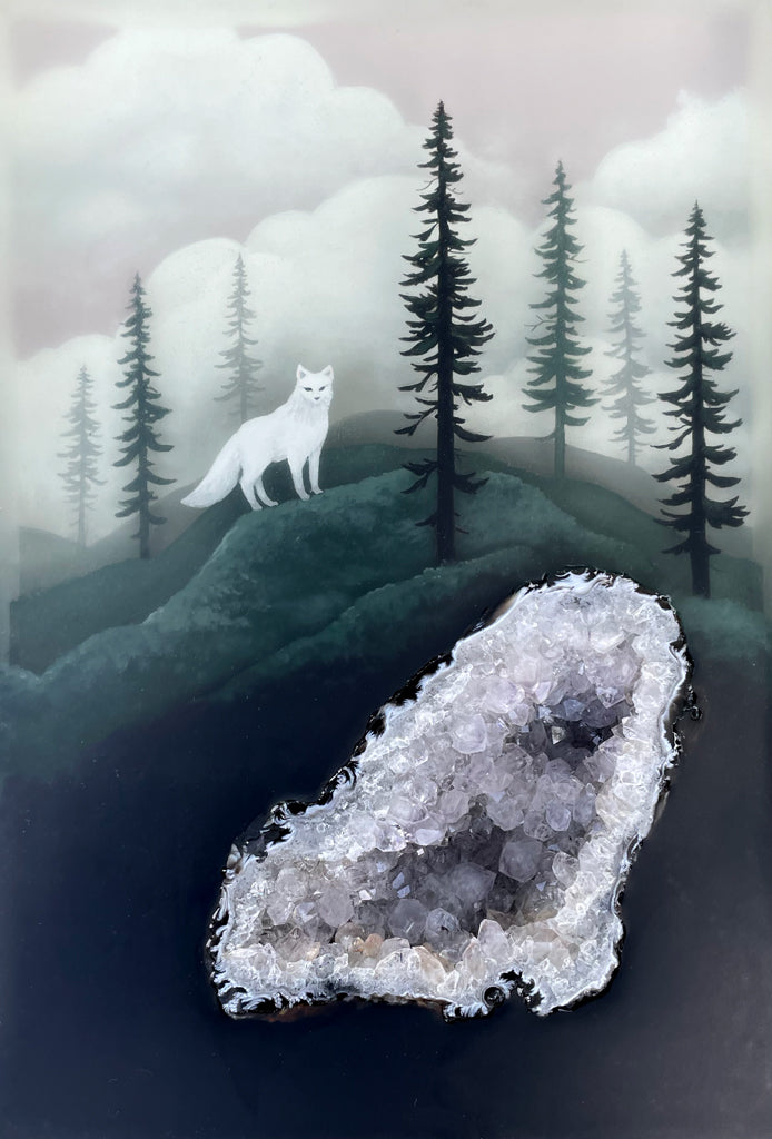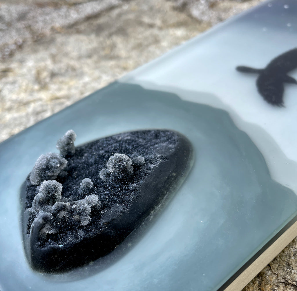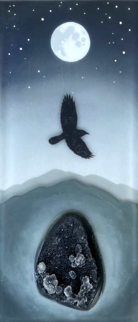 I create intricate, layered resin art featuring hand-painted scenes and ethically sourced natural elements like lichen, bones and gemstones. Each piece is carefully crafted into a delicate, dreamlike landscape. Based in Asheville, NC, I’ve been working with resin for over 25 years, blending my love of nature and storytelling into every creation.