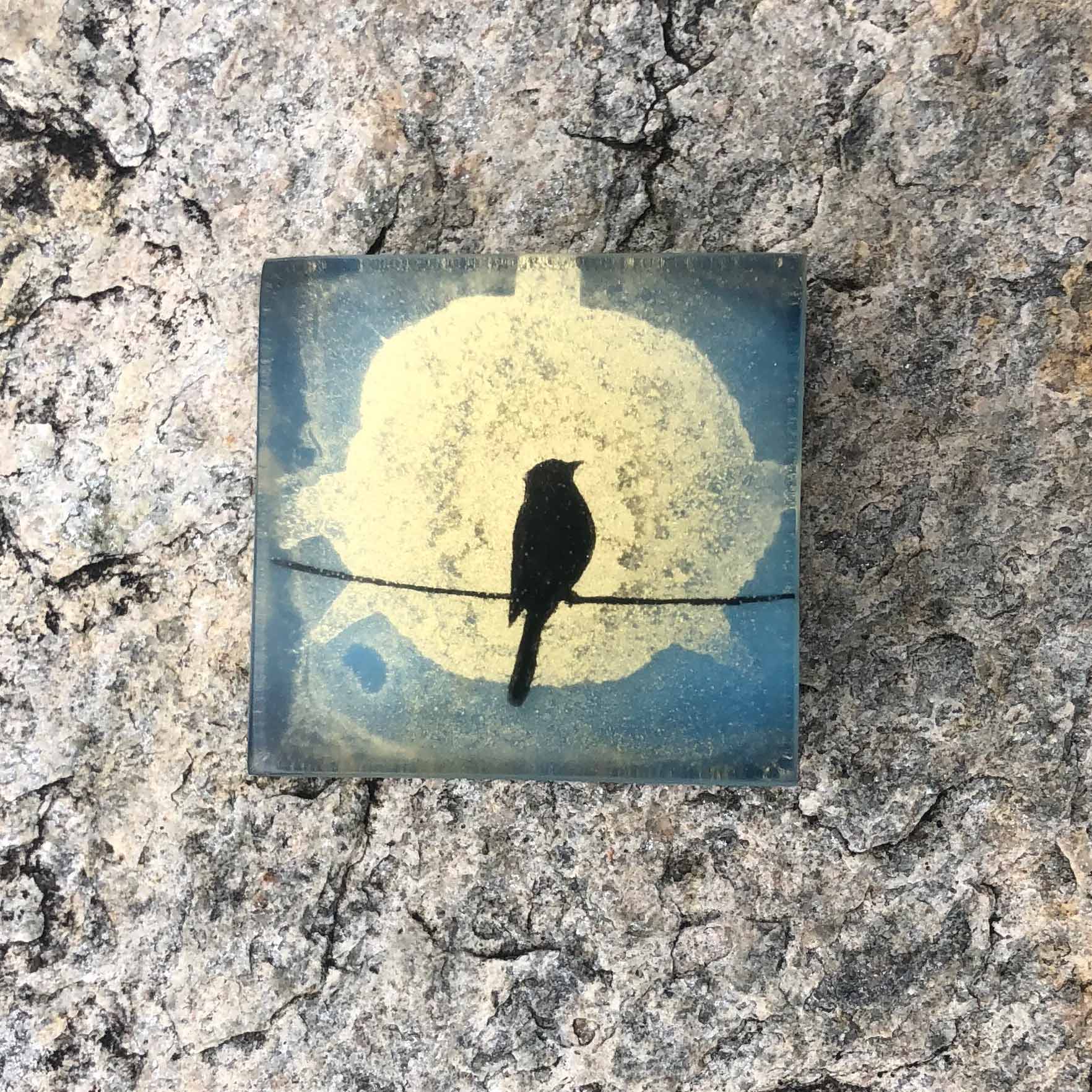 A tiny hand painted bird layered in dimensional resin over gold ink.