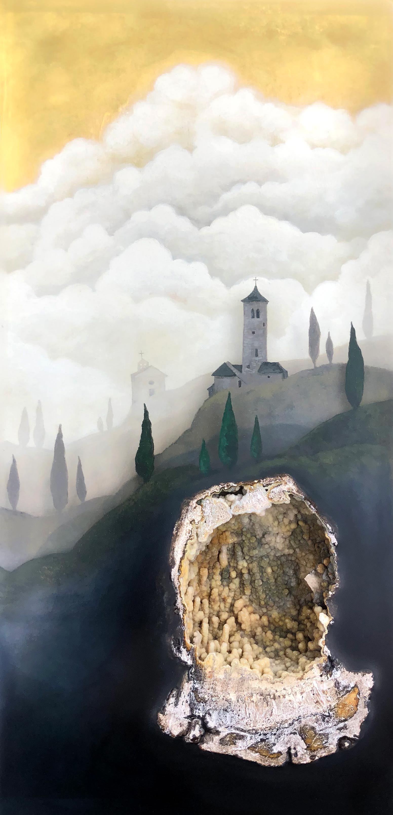 A dreamy, dimensional landscape combining acrylic, ink, and polished layered resin with a real sparkling piece of agatized coral (fossilized coral).