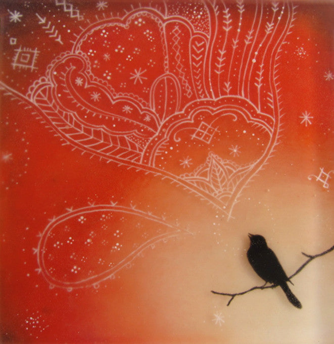 Hand painted/ drawn in acrylic, ink, and pencil and cast in layered resin on wood.
