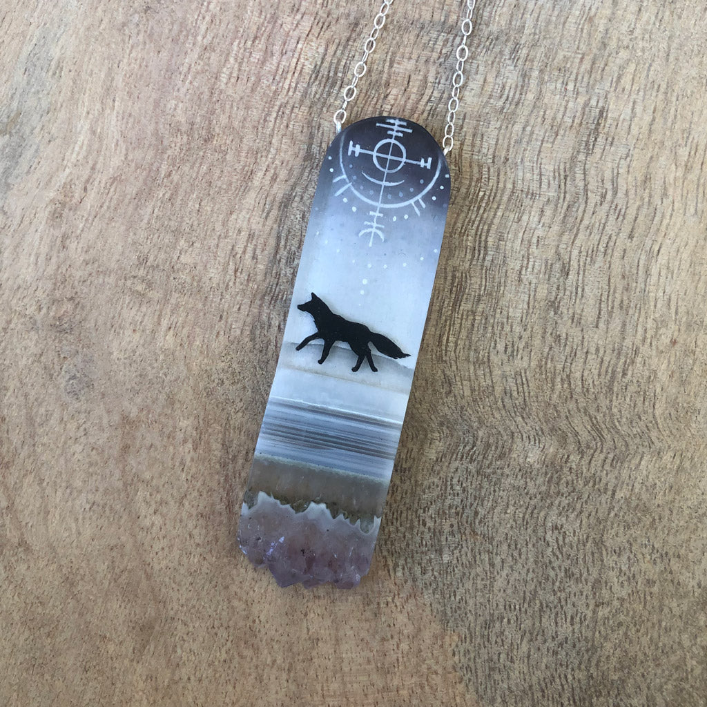 Hand painted in acrylic + ink then layered in dimensional polished resin. A slice of beautifully striated amethyst / jasper is attached.