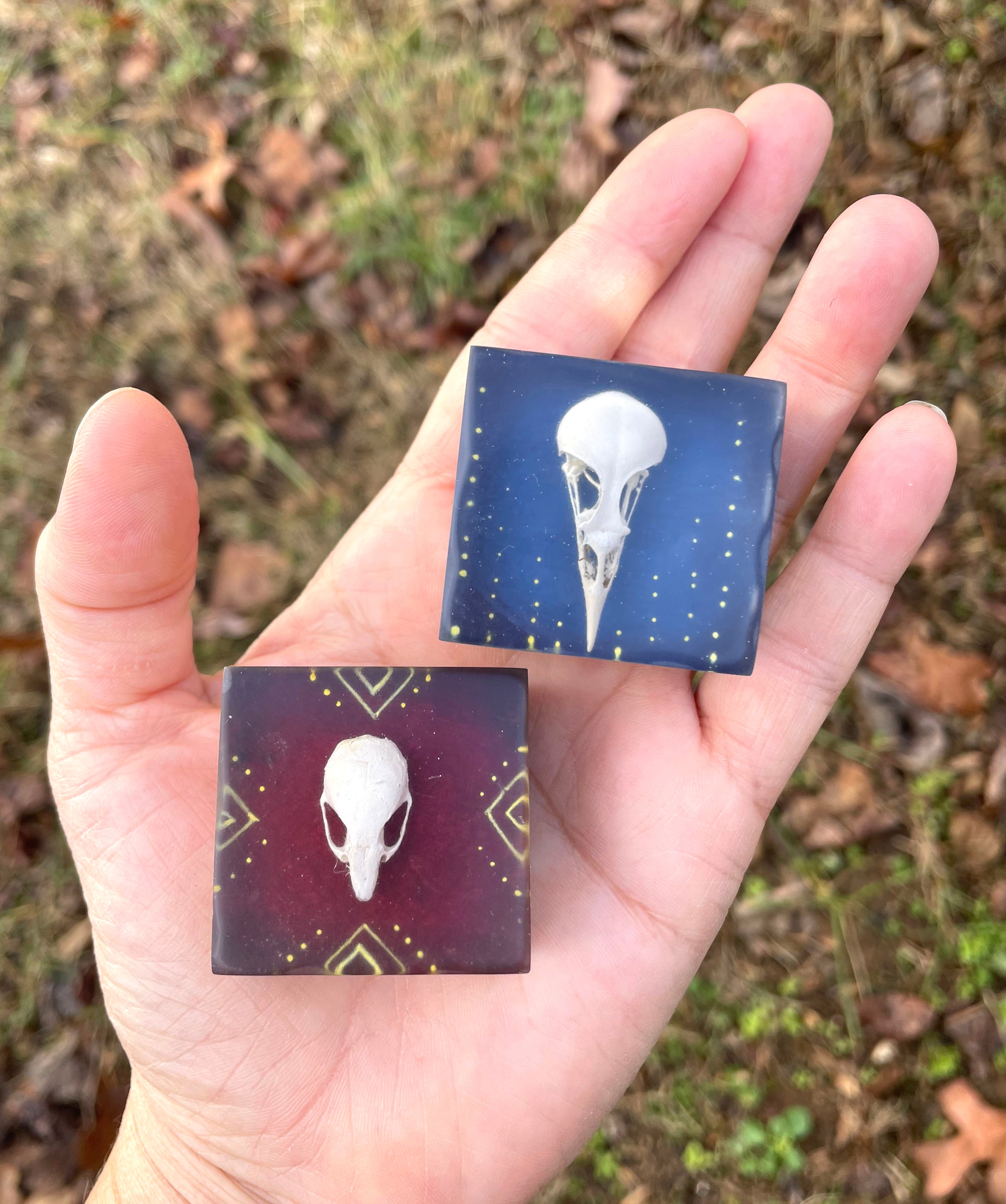 Real finch(?) and mouse skulls encased in layered, polished resin with hand drawn elements. Each one varies slightly.