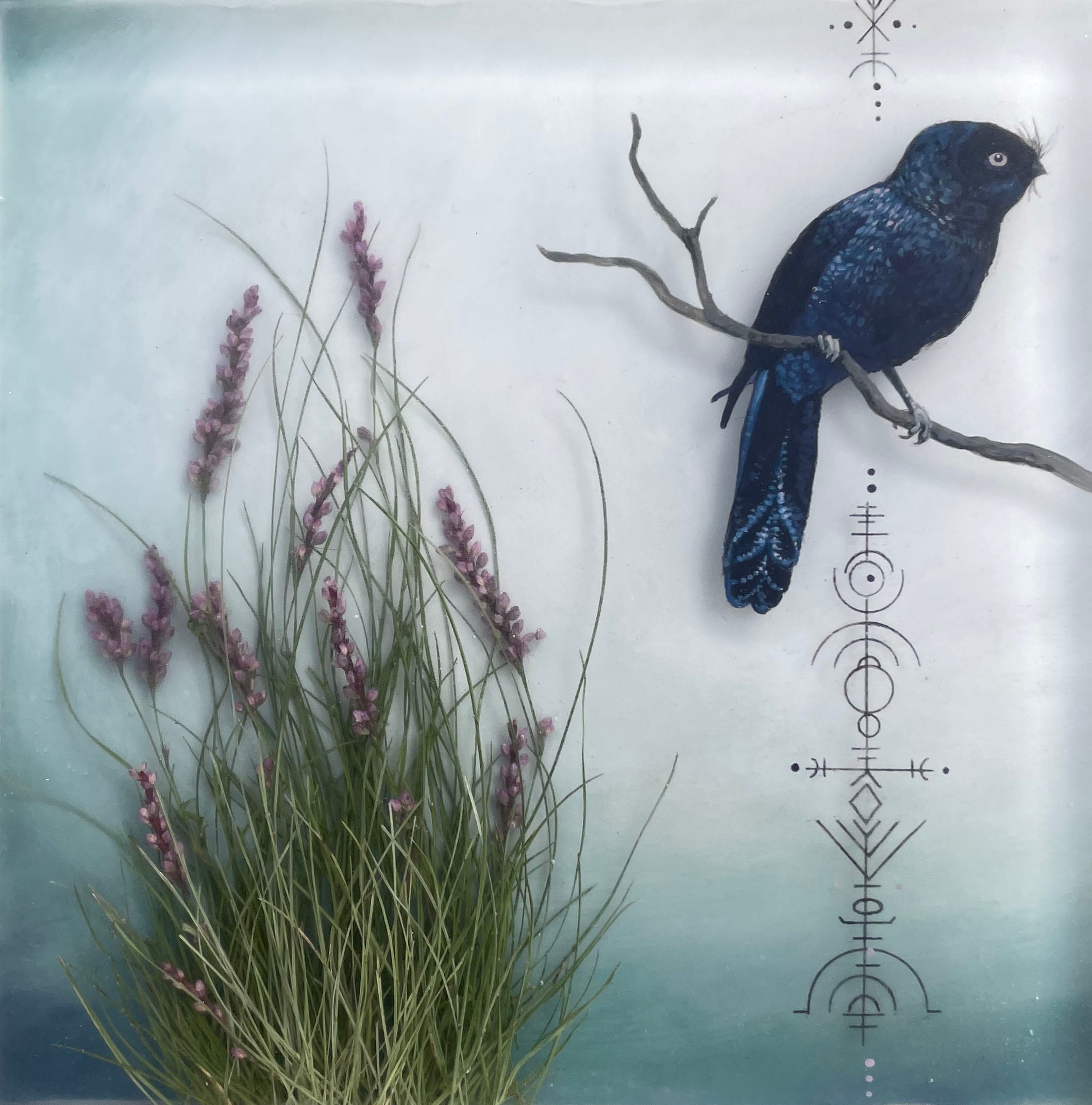 A strange little nightjar layered in polished resin with acrylic, ink, real grass, and flowers.
