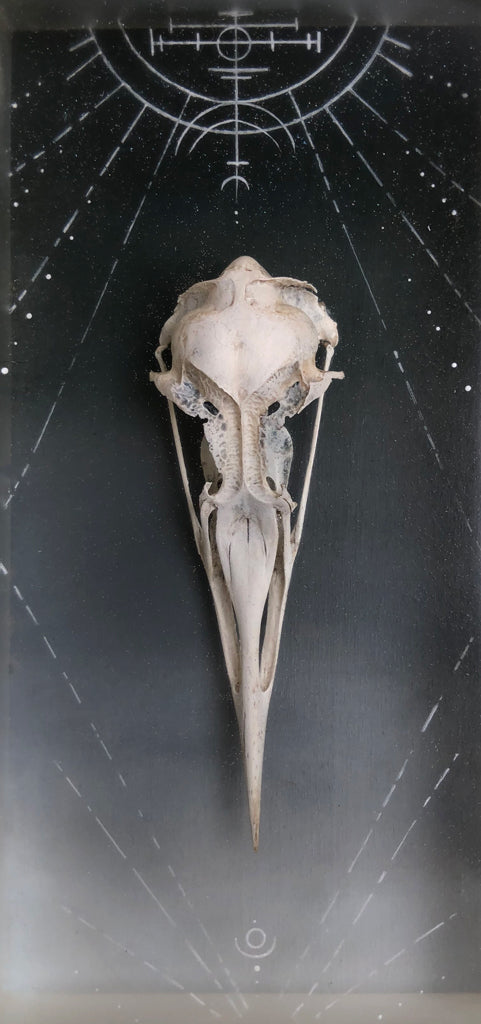 Acrylic, ink, glitter, and a real sea bird skull encased in layers of polished resin.