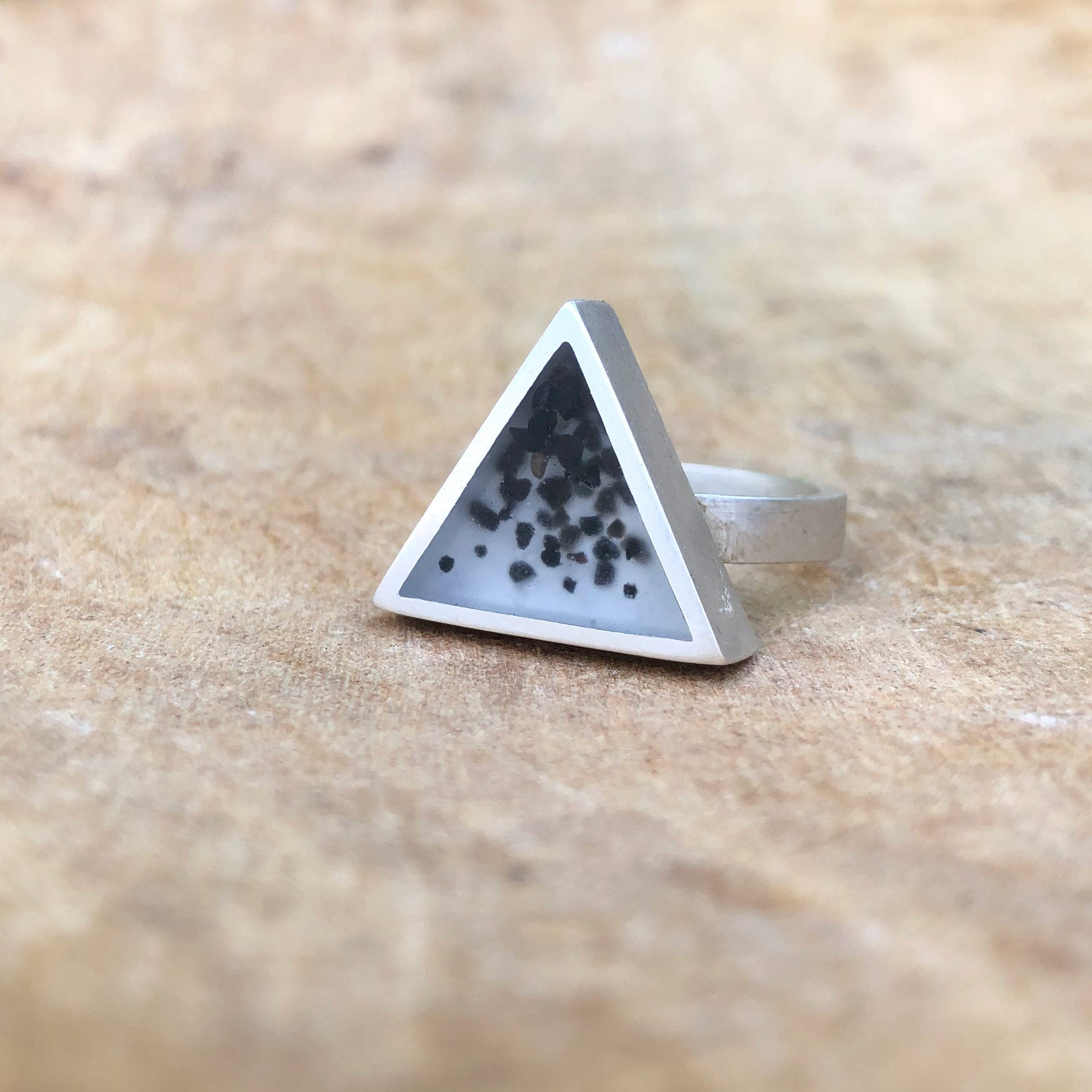 Little grains of black Icelandic lava sand encased in polished resin and set in a sterling silver ring.  The grains are encased at various levels so they appear to "float" within the silver setting.