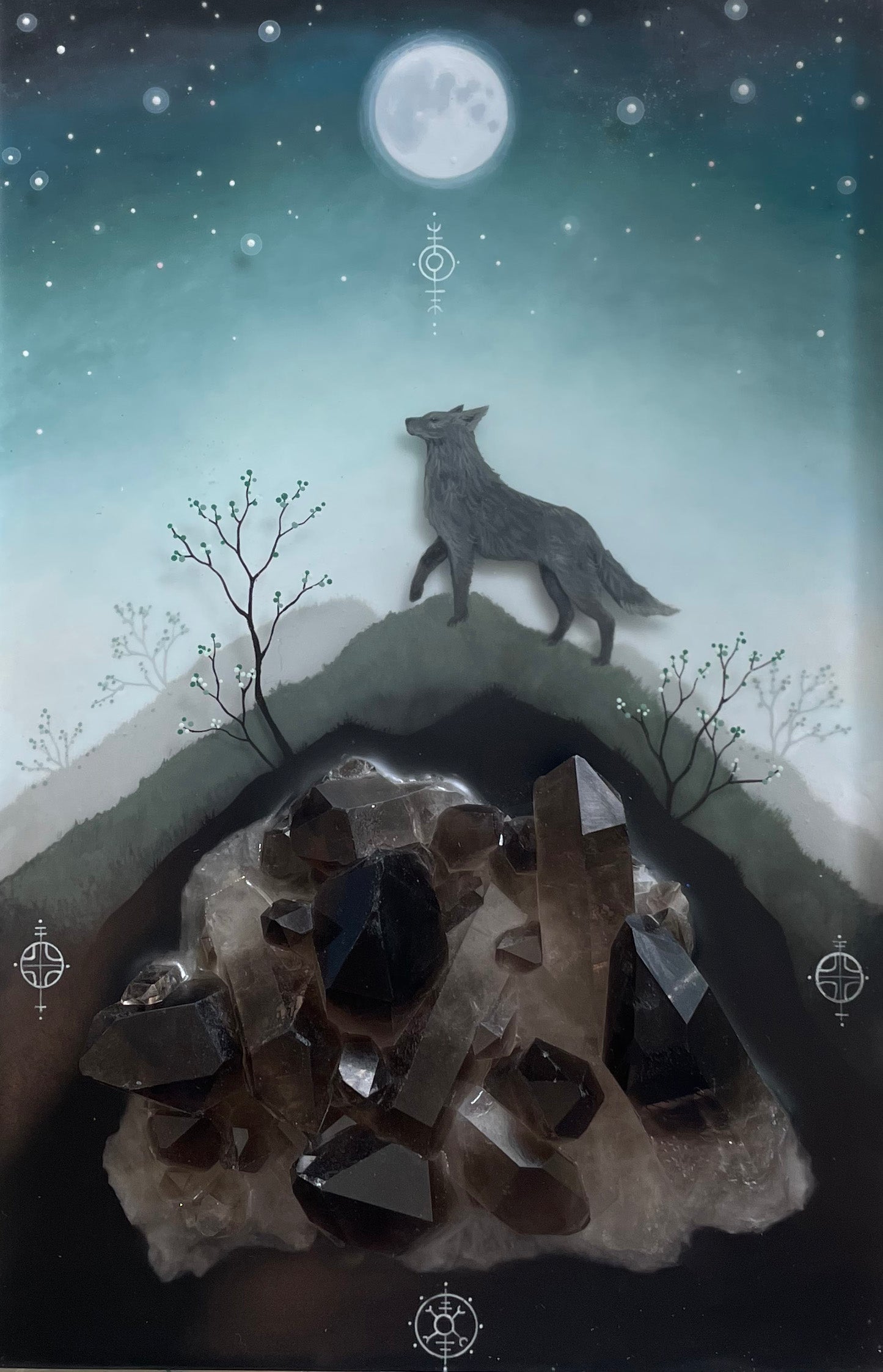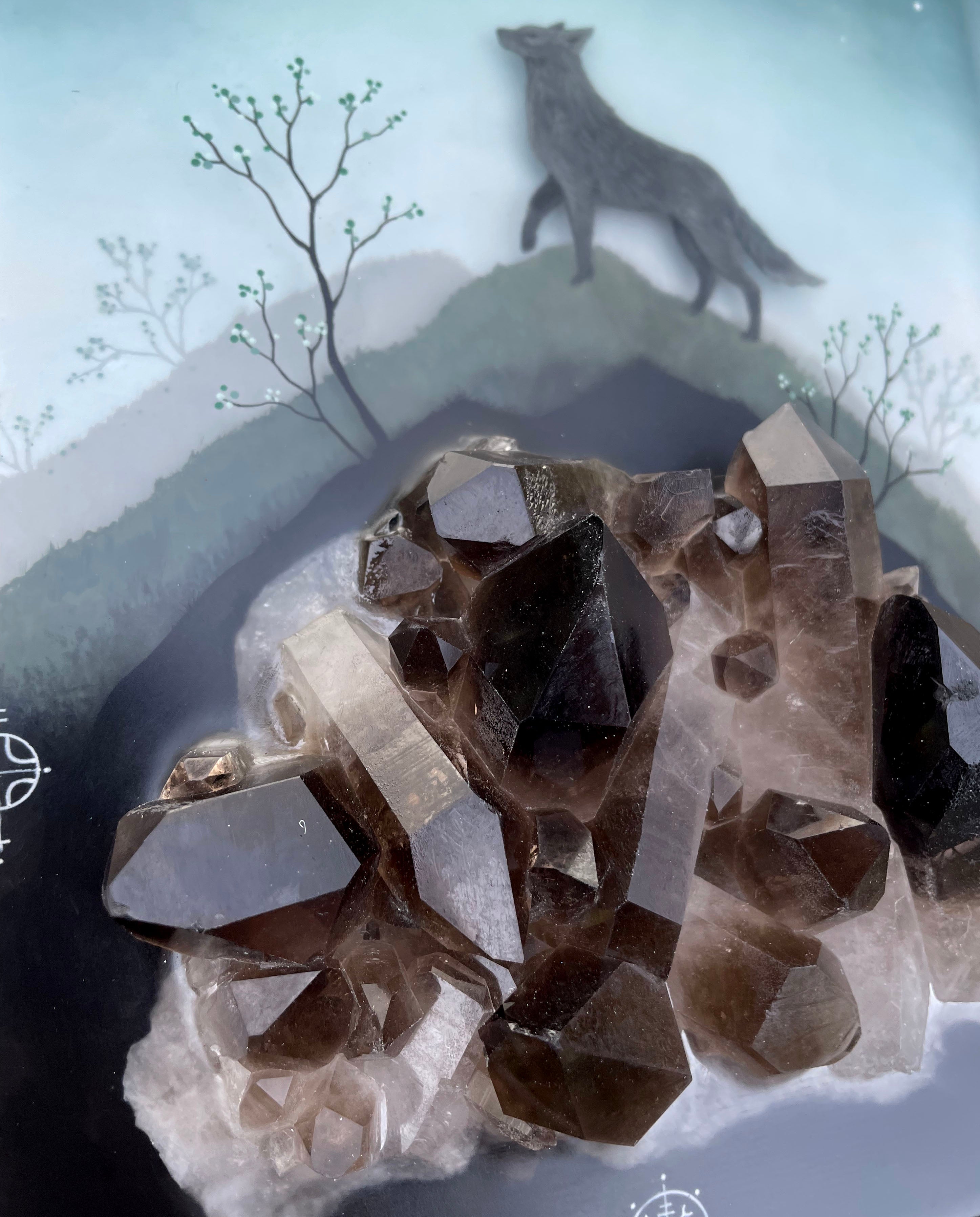 Painted and layered in polished resin with a beautiful, dark smoky quartz partially embedded.