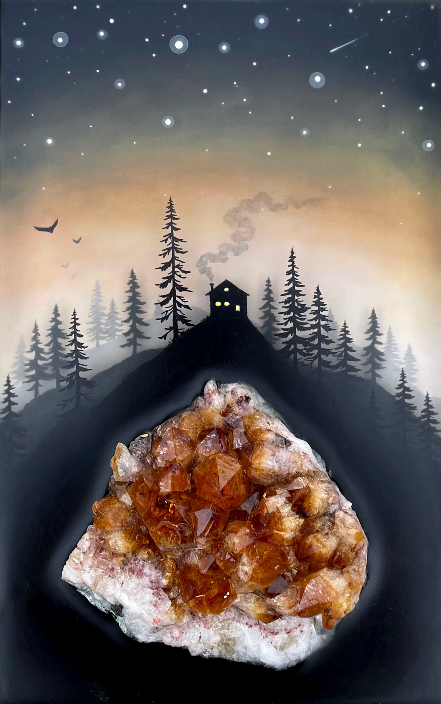 A twilight scene hand painted and layered in polished resin with a citrine crystal partially embedded.