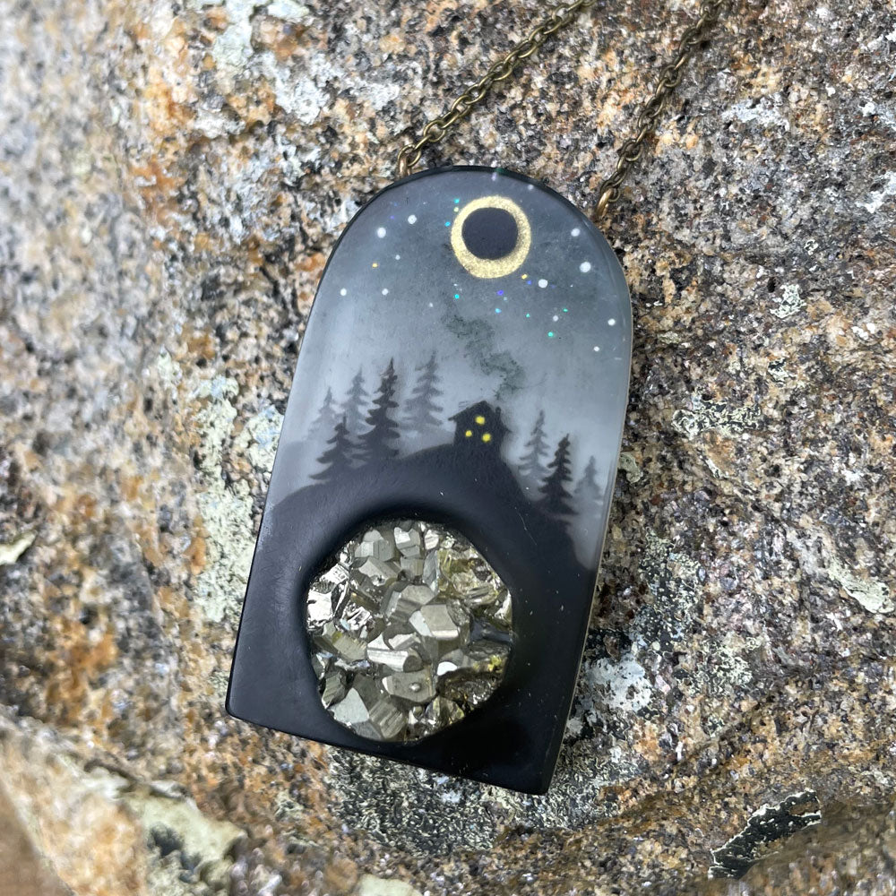 A dimensional hand painted eclipse scene with a real piece of pyrite encased. Pyrite is a stone of abundance, confidence, mental clarity and creativity!