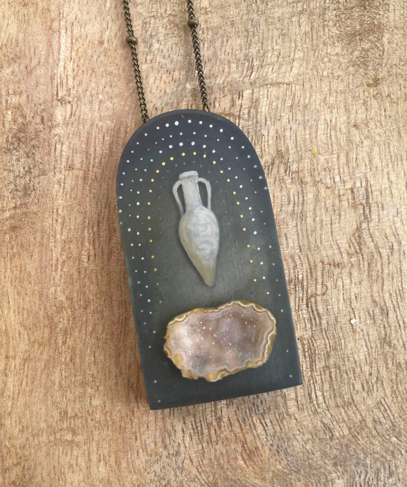 A tiny, hand painted Greek-inspired amphora layered in polished resin with a partially encased geode.
