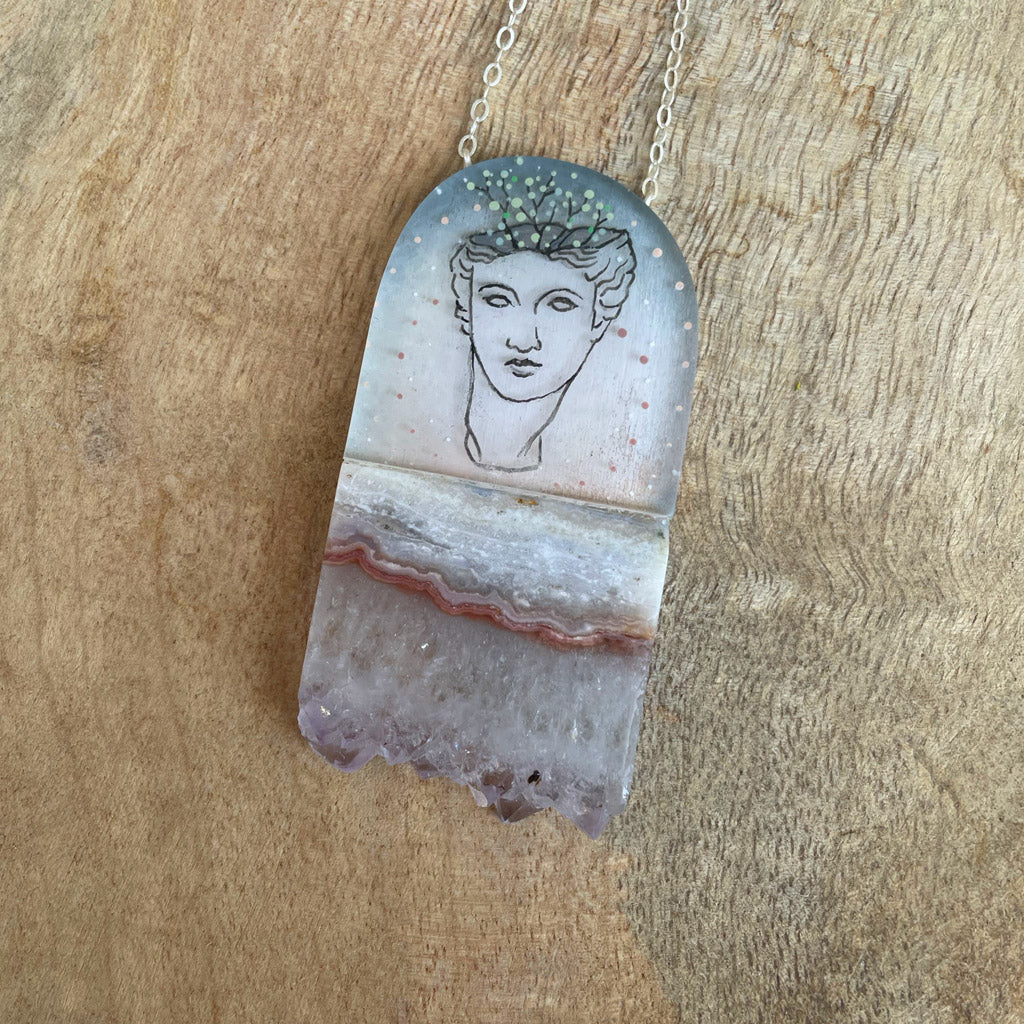 A tiny hand painted necklace inspired by travels through Greece. Attached is a real, unique slice of polished amethyst with jasper. Each piece varies slightly.