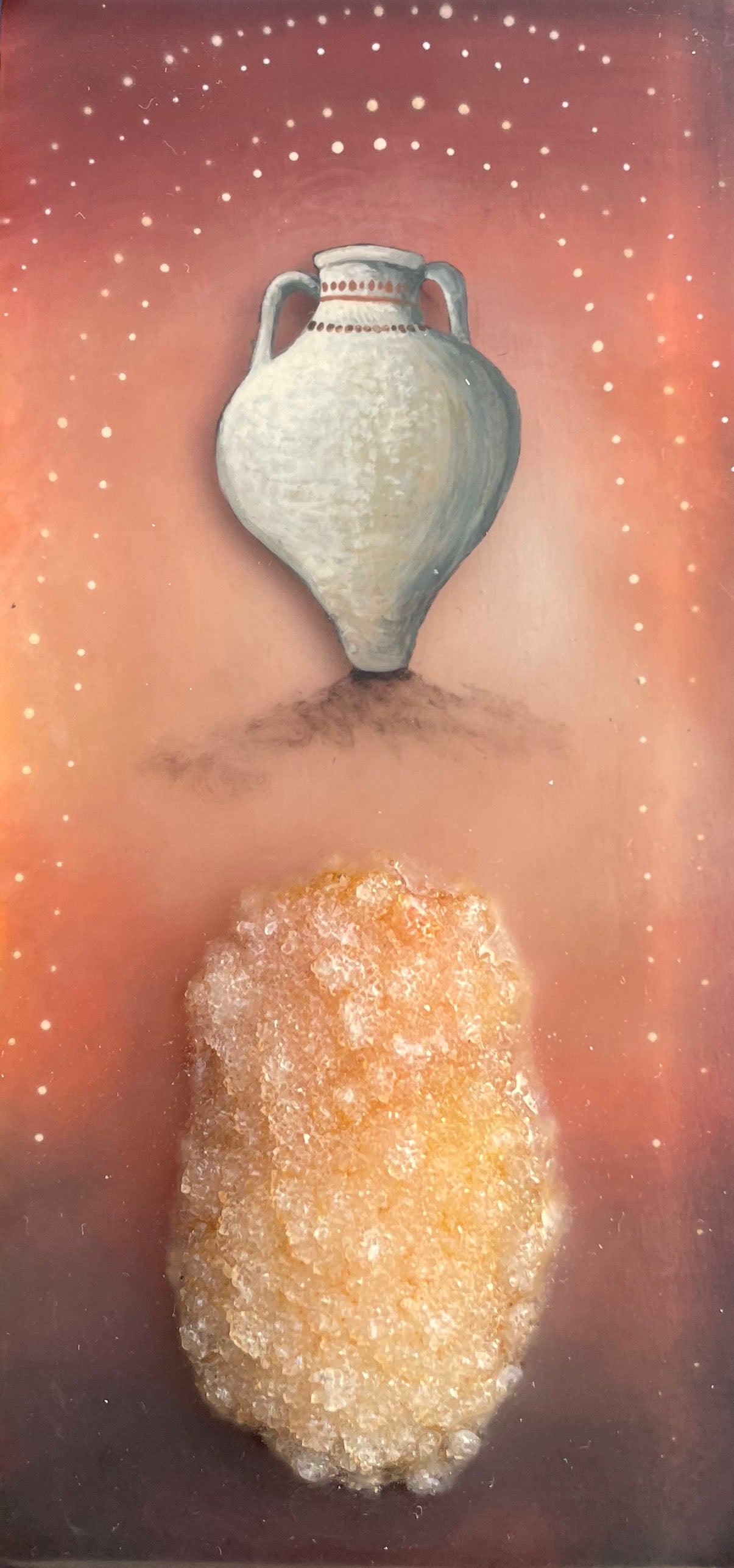 A tiny painted clay amphora. Acrylic, ink, and polished layered resin with a real sparkling piece of embedded orange druzy.
