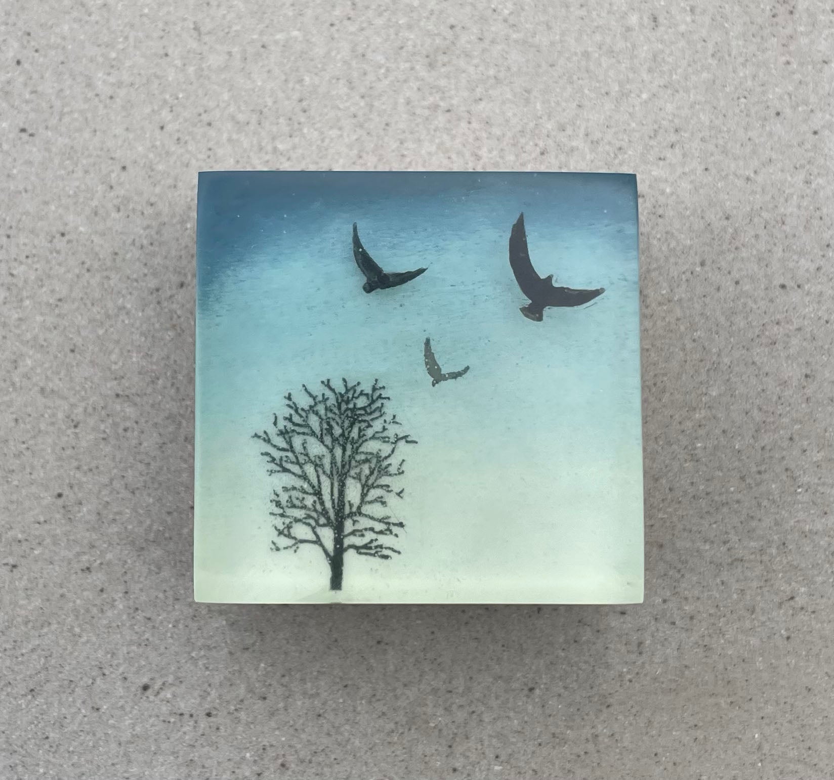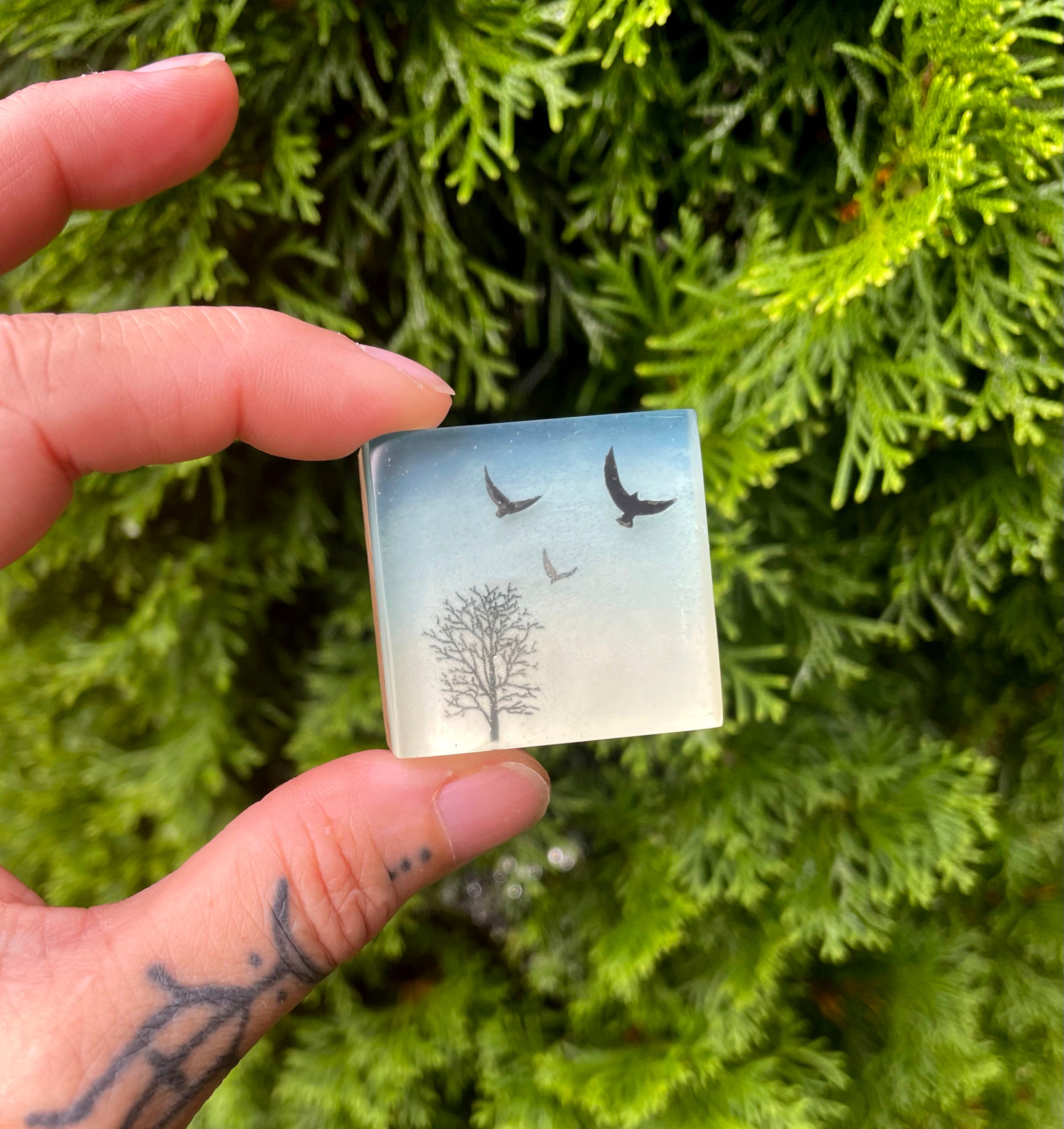 A little lofty scene hand painted in acrylic and ink, then layered in polished resin.