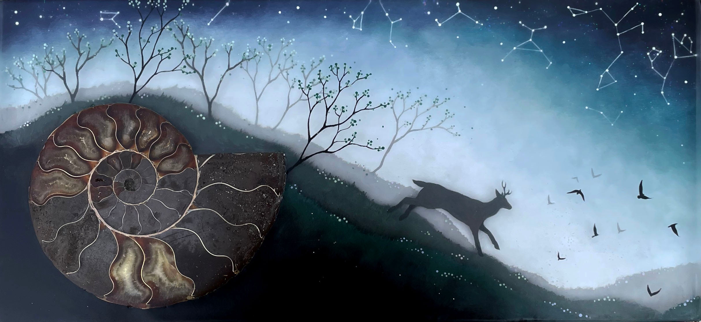 Painted and layered in polished resin with an ammonite fossil partially embedded.