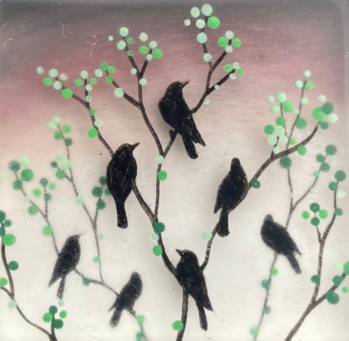 A teeny-tiny gathering of dark birds hand painted and encased in layered + polished resin.
