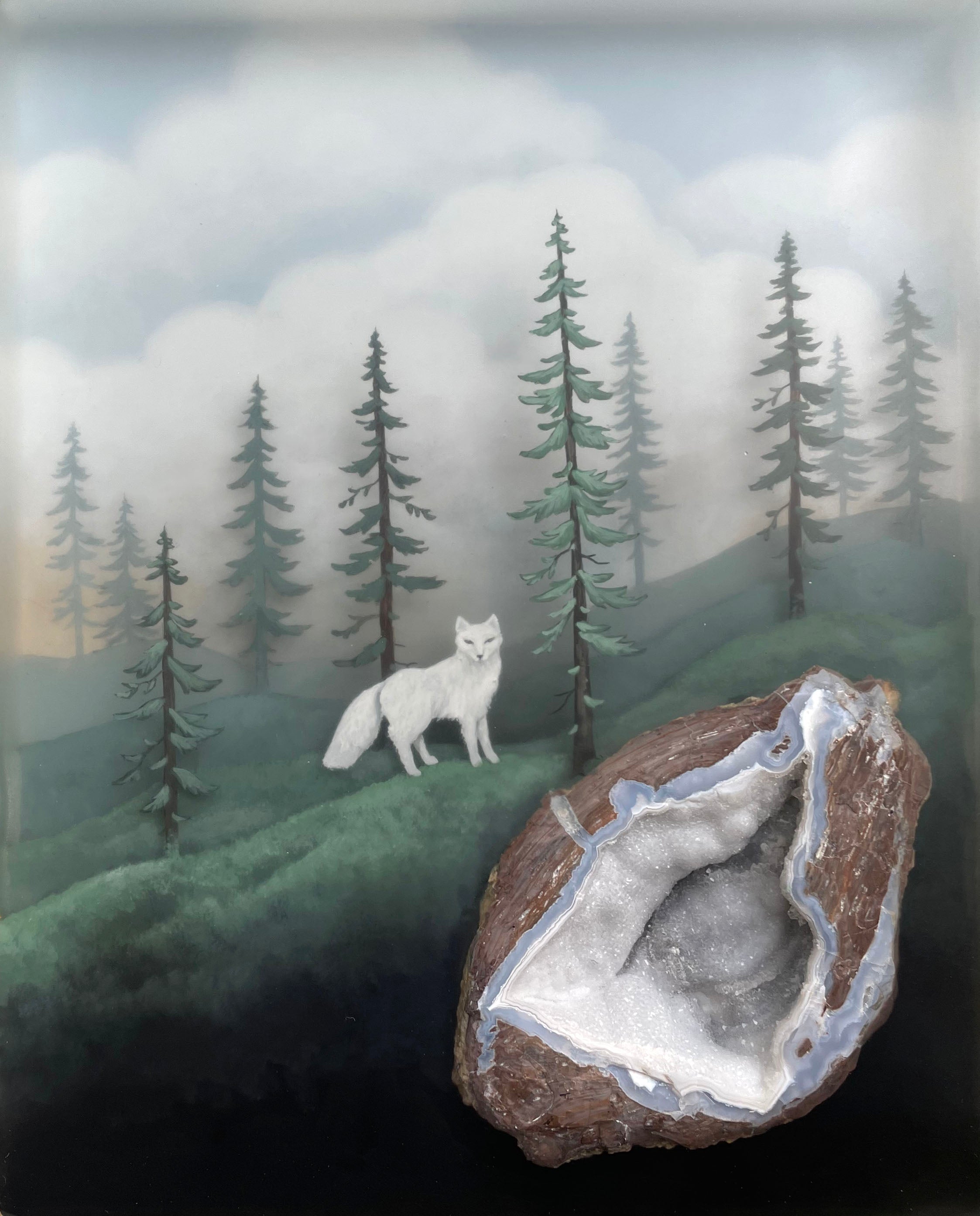 A dimensional forest scene painted in acrylic and ink within deep layers of polished resin. Embedded and flush to the surface is a sparkling pale geode.