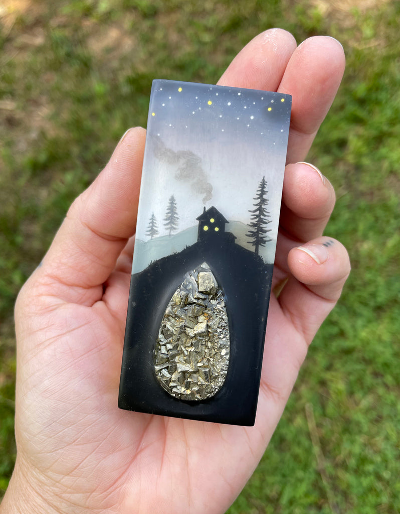 An itty-bitty nighttime landscape layered in dimensional, polished resin with a piece of golden pyrite partially encased.