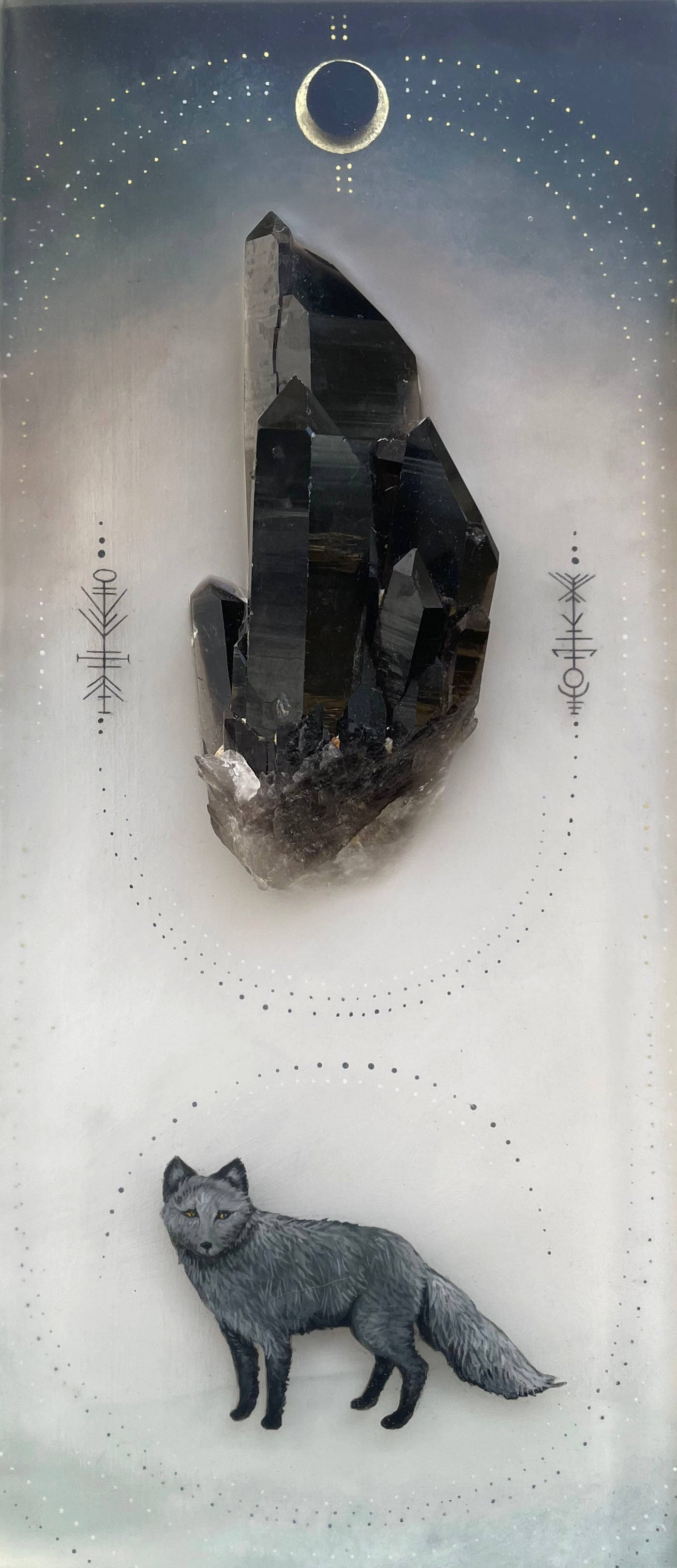 An arctic fox painted and layered in polished resin with a beautiful, dark smoky quartz partially embedded.